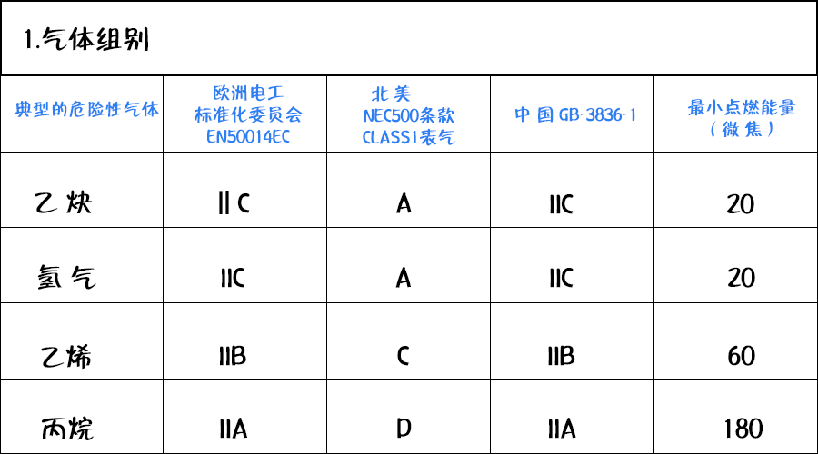 中國(guó)GB3836標(biāo)準(zhǔn)規(guī)定ⅡC級(jí)最小點(diǎn)燃能量為19微焦耳,ⅡA級(jí)最小點(diǎn)燃能量為200微焦耳。