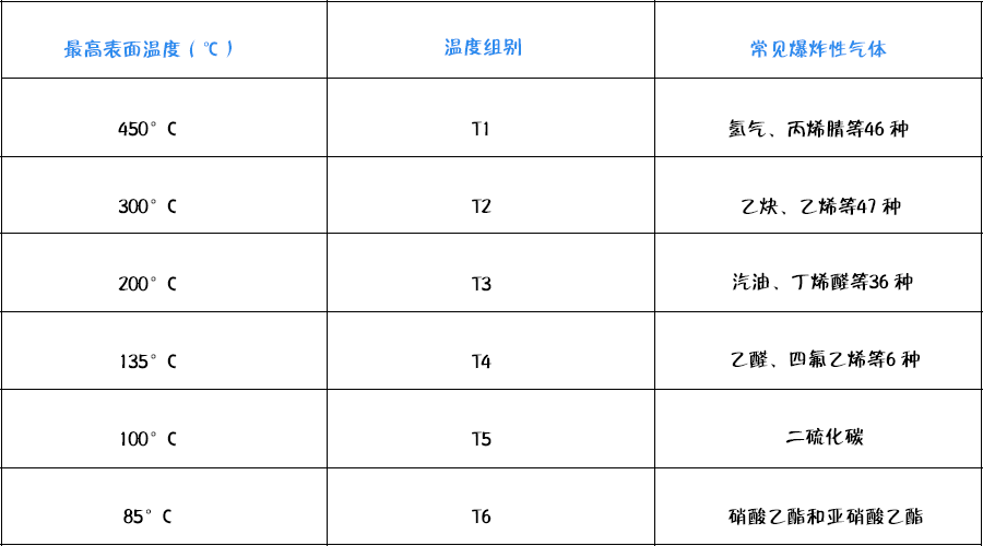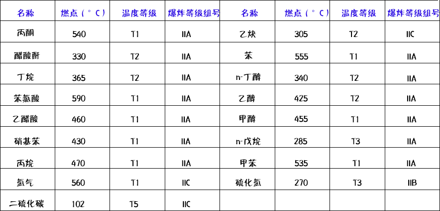 這是與氣體點(diǎn)燃溫度有關(guān)的電氣設(shè)備(假定環(huán)境溫度為40℃時(shí))的最高表面溫度,點(diǎn)燃能量與點(diǎn)燃溫度無(wú)關(guān)。在標(biāo)準(zhǔn)BS5345第一部分中列出了所有可燃性氣體和其組別。