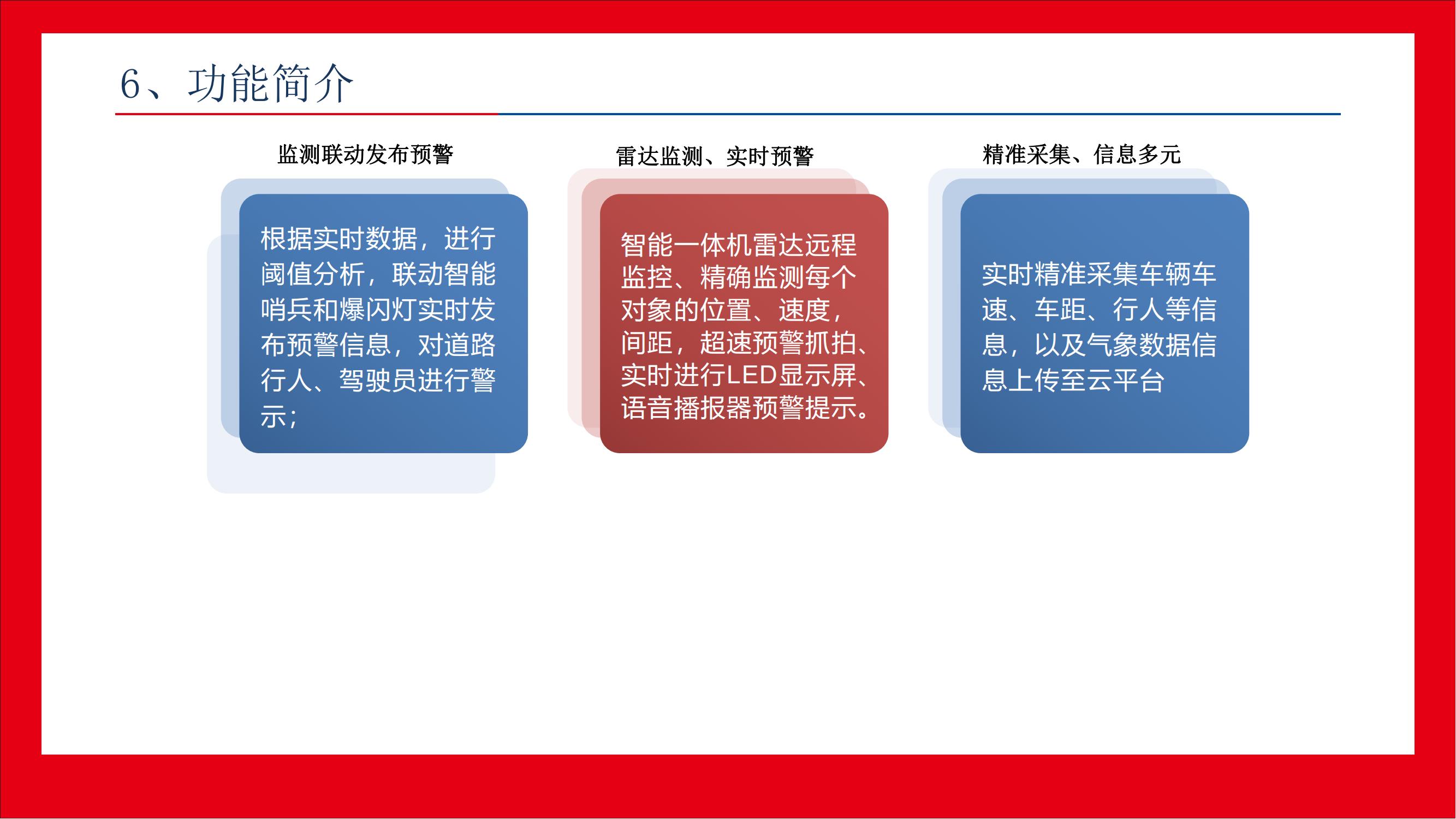 l 一體化設(shè)備:集雷達(dá)監(jiān)測、聲音預(yù)警(號角喇叭)、燈光預(yù)警(紅藍(lán)爆閃燈、速度顯示、文字顯示)、視頻取證等功能,對行車安全起到預(yù)警作用。